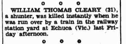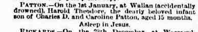 1335. Robert Henry PATTON (Robert Ninian PATTON1131, William PATTON921, Robert PATTON Esq; Writer to the Signet749, Annie SINCLAIR606, John427, James291, MAGNUS224, Alexander177, JAMES of Newclett and Estaquoy143, Thomas108, Alexander Of Dunbeath And Stemster67, William 2nd Earl Of Caithness45, William 1st Sinclair Earl Of Caithness - 3rd Earl Of Orkney39, Henry 2nd Earl Of Orkney27, Henry Lord Of Roslin, Earl Of Orkney (Prince)21, William Of Roslin18, William Of Roslin (Sir)16, Henry Of Roslin (Sir)15, William (Sir)11, Henri10, Henri9, William8, Henri7, Henri3, William 'The Seemly'2, Walderne1) was born in 1890 in Wandong, Victoria 3758 and died in 1890 in Tallarook, Victoria.