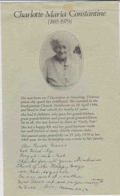 Charlotte married Benjamin James CONSTANTINE 358,359,360,505 on 24 Apr 1906 in Presbyterian Church, Northcote, Melbourne, Victoria, Australia.360 Benjamin was born in 1881 in Brunswick, Melbourne, Victoria, Australia358,505 and died in 1965 in Northcote, Melbourne, Victoria 3070358 at age 84.