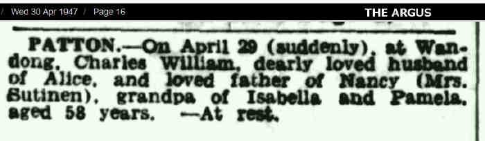 1333. Charlotte Maria PATTON 82,358,359,505 (Robert Ninian PATTON1131, William PATTON921, Robert PATTON Esq; Writer to the Signet749, Annie SINCLAIR606, John427, James291, MAGNUS224, Alexander177, JAMES of Newclett and Estaquoy143, Thomas108, Alexander Of Dunbeath And Stemster67, William 2nd Earl Of Caithness45, William 1st Sinclair Earl Of Caithness - 3rd Earl Of Orkney39, Henry 2nd Earl Of Orkney27, Henry Lord Of Roslin, Earl Of Orkney (Prince)21, William Of Roslin18, William Of Roslin (Sir)16, Henry Of Roslin (Sir)15, William (Sir)11, Henri10, Henri9, William8, Henri7, Henri3, William 'The Seemly'2, Walderne1) was born on 7 Dec 1885 in Wandong, Victoria 3758358,505 and died on 25 Jul 1979 in Pascoe Vale, Victoria, Australia358 at age 93.