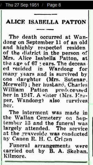 1334. Edith May PATTON 358,505 (Robert Ninian PATTON1131, William PATTON921, Robert PATTON Esq; Writer to the Signet749, Annie SINCLAIR606, John427, James291, MAGNUS224, Alexander177, JAMES of Newclett and Estaquoy143, Thomas108, Alexander Of Dunbeath And Stemster67, William 2nd Earl Of Caithness45, William 1st Sinclair Earl Of Caithness - 3rd Earl Of Orkney39, Henry 2nd Earl Of Orkney27, Henry Lord Of Roslin, Earl Of Orkney (Prince)21, William Of Roslin18, William Of Roslin (Sir)16, Henry Of Roslin (Sir)15, William (Sir)11, Henri10, Henri9, William8, Henri7, Henri3, William 'The Seemly'2, Walderne1) was born on 10 Dec 1887 in Wandong, Victoria 3758358,505 and died on 11 May 1957 in Murchison, Victoria 3610358 at age 69.