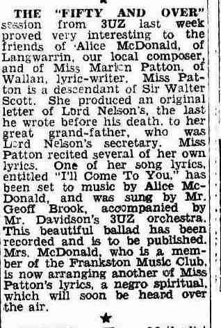 and was on an orchard in Shepparton. John was thrilled with the life (Hamiltons had three beautiful & highly accomplished daughters, but no money !) and he sent us glowing accounts of the life on the orchard, by this time my sister's fiancee, who had been de-mobbed as a young Lieutenant from the navy, had also come out and was working at J.C. Williamsons. His name was J. Alan Kenyon and he was Art Director of J.C.'s until he died in the early 70's. Anyhow we were all here by 1923 and I also took a job at 10/6 a week to gain experience fruit growing. I decided that orcharding was not for me and I thought the risk too great for my mother to spend the little money we had so, back to Melbourne and the engineering. My mother bought a house in Brighton - I think it was £1100- from where we all eventually married and started the usual fifty or so years to bring up our families.